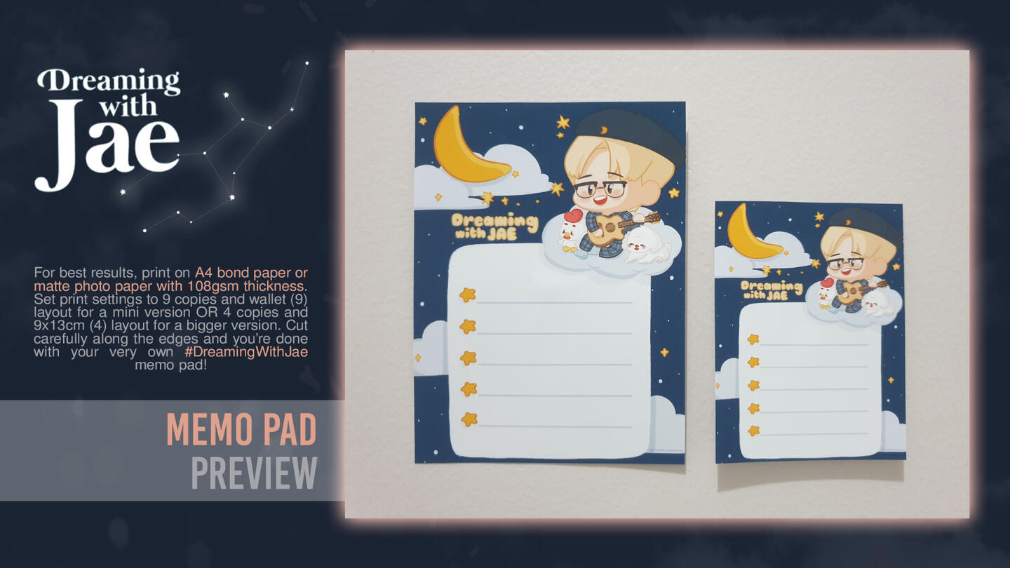 For best results, print on A4 bond paper or matte photo paper with 108 gsm thickness. Set print settings to 9 copies and wallet (9) layout for a mini version OR 4 copies and 9 x 13 cm (4) layout for a bigger version. Cut carefully along the edges (using a paper cutter is recommended to achieve straight edges but not required) and you're done with your very own #DreamingWithJae memo pad! Feel free to stick on your journal or desk and use as a to-do list, bucket list, merch shopping list or grocery list.