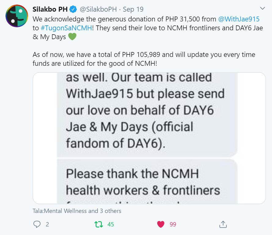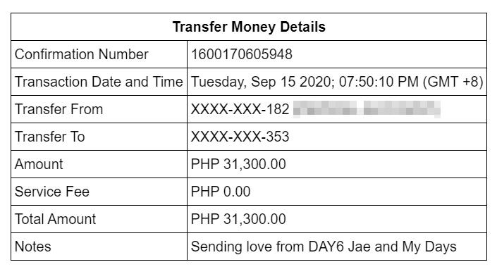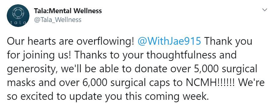 We have already transferred PHP 31,500 (roughly USD 650) to Tala: Mental Wellness via their BPI and GCash accounts. NCMH is currently in need of gloves, face masks and hair caps. Tala will be sourcing these and check when they can send them over to NCMH. We will send a detailed donation report to all donors once Tala has delivered our donation on behalf of DAY6 Jae and My Days.